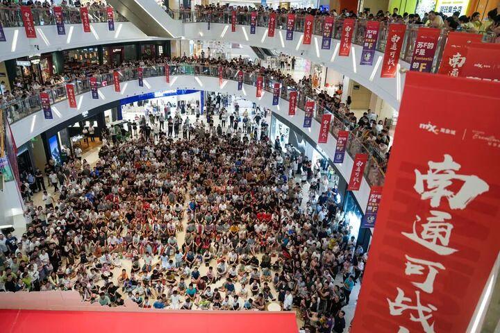 2025年6月29日,市民、球迷在江苏省南通市内一处商场观看“苏超”第五轮南通队坐镇主场对阵宿迁队的比赛直播。新华社记者 李博 摄
